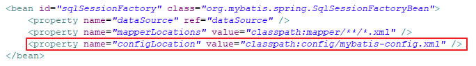 Mybatis 설정파일을 로드하는 방법은 스프링의 context 설정 중 sqlSessionFactory를 설정하는 부분에 configLocation 값으로 mybatis 설정파일 경로를 넣어주면 된다. 내 설정파일은 클래스파일 경로에 포함되어있기 때문에 다음과 같이 classpath 로 경로설정을 하였다.