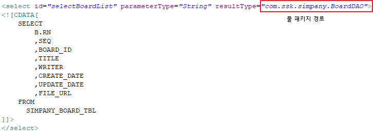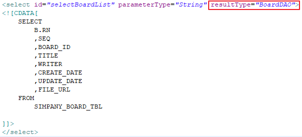 스프링 서버에서 DB 조회 결과를 내가 커스텀한 객체(DAO)로 가져오고 싶은 경우가 있다. 그럴 때 아래 예제처럼 resultType을 풀패키지 경로로 입력해야한다. 만약 입력한 BoardDAO 객체가 다른 쿼리에서도 사용된다면, 해당 쿼리의 resultType 또한 풀 패키지경로로 입력해야할 것이다. 추가로 패키지 경로가 바뀌거나 클래스 명이 바꿔버린다면? 모든 쿼리 설정파일을 바꿔줘야할 것이다.