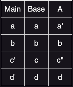 만약 Base Commit 없이 Main 브랜치와 A 브랜치로만 병합해야한다면 어떨까? b는 둘다 똑같으니 문제되지 않지만, a와 a'는 둘 중 어떤 코드가 베이스 코드인지, 수정된 코드인지 알 수 없고, d'와 d도 마찬가지 상황에 처한다. 병합 시 a와 a', d'와 d 중 어느 코드를 적용해야할 지 모르는 상황이다. 이를 알기위해선 개발자가 직접 두 브랜치의 공통되는 커밋, 즉 조상 커밋을 찾고 어떤 부분이 수정됐는지를 체크해야한다.