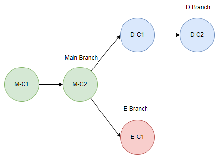 그리고 다른 개발자는 E 기능을 개발하기 위해 마찬가지로 Main 브랜치로부터 E 브랜치를 생성하고, 작업을 하며 E-C1 Commit을 한 상황이다. E 브랜치의 Base Commit은 M-C2이다.