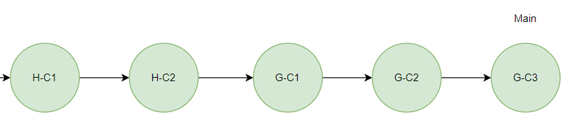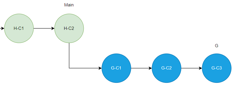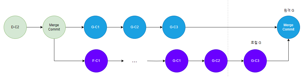 G 브랜치에서 작업 후 PUSH를 했을테니 로컬, 원격 브랜치 모두 아래와 같이 G-C1, G-C2, G-C3 커밋이 있었을 것이다.