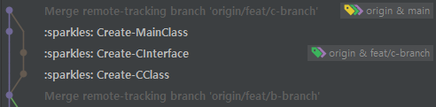 실 테스트를 위해 c-branch를 만든 후 Create-CClass, Create-CInterface commit 후, Main 브랜치에서 Create-MainClass라는 커밋을 생성하였다. Main 브랜치에서 c-branch 를 Merge 하니 아래와 같은 형태의 깃 트리와 Merge Commit 이 생성됨을 확인할 수 있다.