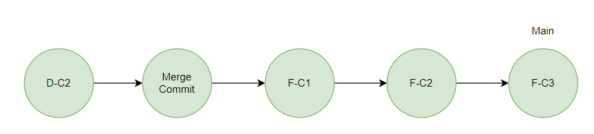 개발이 끝나고 테스트까지 마친 D 기능은 운영 반영을 위해 Main 브랜치에서 Merge 되게 된다. Main 브랜치의 Header Commit과 병합하려는 D 브랜치의 Base Commit이 일치하므로 Fast Forward 방식으로 병합된다.