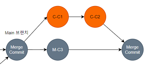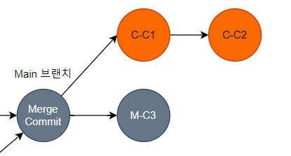 Main 브랜치를 기준으로 C 브랜치를 생성하고 C 브랜치의 작업자가 두 개의 Commit 을 생성하는 사이, Main 브랜치에서 M-C3 커밋이 발생했다. 이때 Main 브랜치의 Head Commit은 M-C3, C 브랜치의 Base Commit은 Merge Commit로 현재 브랜치의 Head Commit과 병합하려는 브랜치의 Base Commit이 일치하지 않아 3-way-merge 방식으로 병합되게 된다.