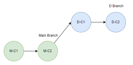 개발자는 D 기능 개발을 위해 Main 브랜치로부터 D 브랜치를 생성하고, 작업을 하며 D-C1, D-C2 Commit을 한 상황이다. 이때 D 브랜치의 Base Commit은 M-C2이다.