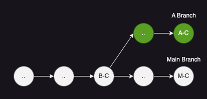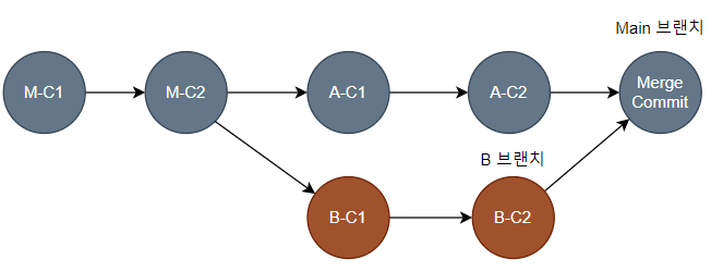 Main 브랜치에 A 브랜치를 병합하는 상황을 가정하고, 메인 브랜치의 커밋을 M-C, 공통 조상이 되는 커밋을 B-C, 병합할 브랜치의 커밋을 A-C라고 가정하겠다. 생성된 커밋 히스토리는 아래와 같다.