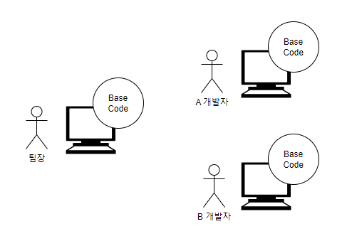 첫째, 팀장님이 개발자 두 명에게 각각 A와 B 기능을 구현하라고 지시했다. 협업이 시작된것이다. 이 회사는 Git이나 SVN과 같은 SCM을 도입하지 않아 팀장님이 갖고 있는 Base Code를 복사해서 자신의 로컬 환경으로 옮겼다. (참고로 Base Code는 현재 운영중인 코드이다.) 이로써 개발자들은 독립적인 개발 환경을 갖추게 되었다.