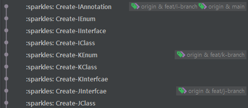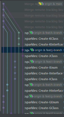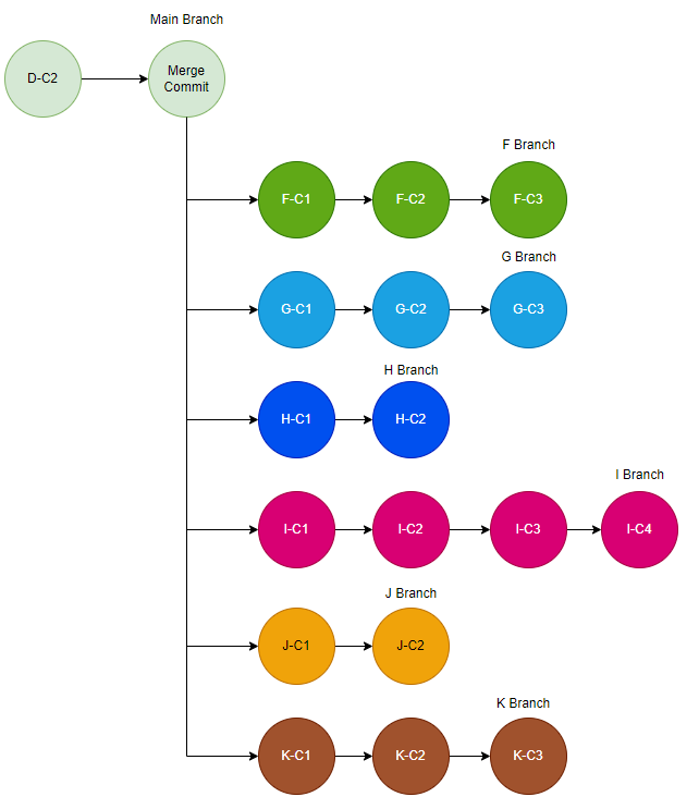 연초에 들어서니 개발 및 수정 요청건이 많아져 F, G, H, I, J, K 기능을 개발해야 하는 상황이 발생했다. 마찬가지로 Main 브랜치로부터 각각의 브랜치를 생성한 후 개발을 진행했으며, 결과적으로 아래와 같은 깃 히스토리가 만들어지게됐다.