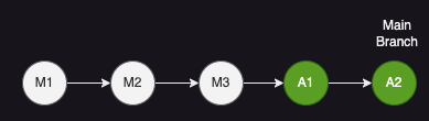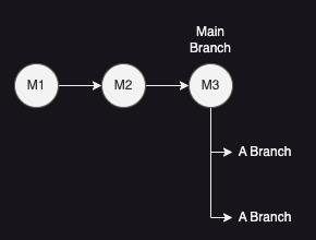 셋째, Main 브랜치에서 A 브랜치를 Merge 했을 것이다. 'Main 브랜치의 Head Commit (M3) 기준으로 생성된 A 브랜치'가 생성되고 난 후 Main 브랜치의 커밋 내역이 없으므로 Fast-Forward 방식으로 병합될 것이다. Fast-Forward 방식은 바로 아래 설명하도록 하겠다.