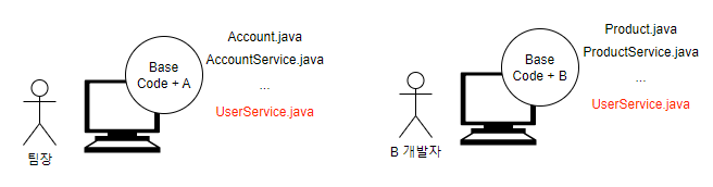 넷째, 다음 날 팀장님은 B 기능을 반영하기 위해 Base Code(지금은 A와 병합된 코드가 Base Code이다) 와 B 개발자가 작업한 코드를 병합하려했다. 앞서 A 개발자의 코드를 그대로 가져올 순 없었다. B 개발자가 개발한 코드에는 A에 대한 기능이 없기 때문이다. 때문에 업데이트된 Base Code와 Base Code + B 코드를 비교하며 수정된 부분을 추출하여 병합하기로 했다. 그런데 이게 웬걸, A 개발자가 기능 구현을 위해 수정했던 UserService의 코드를 B 개발자도 수정한 것이다. 앞서 말한 동일한 코드를 수정한 상황이다. 이때 코드 충돌이 발생한다.
