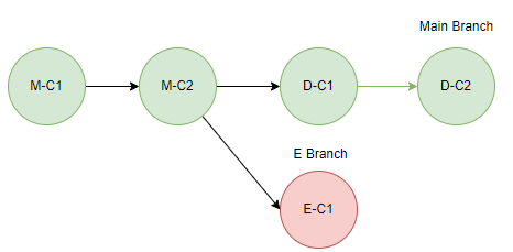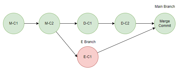 그리고 다른 개발자는 E 기능을 개발하기 위해 마찬가지로 Main 브랜치로부터 E 브랜치를 생성하고, 작업을 하며 E-C1 Commit을 한 상황이다. E 브랜치의 Base Commit은 M-C2이다.