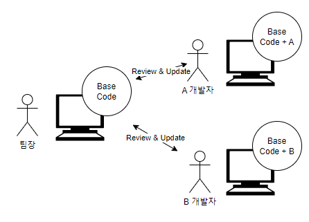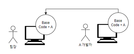 셋째, A 개발자가 작업한 A 기능을 선 반영하고, 하루 뒤에 B 개발자가 개발한 B 기능을 반영하기로 했다. 팀장님은 A 기능을 반영하기 위해 자신의 Base Code와 A 개발자가 작업한 코드를 병합한 후 코드를 운영서버에 반영했다. 병합은 어렵지 않았다. 팀장님이 갖고 있던 Base Code는 A 개발자에게 Base Code를 전달한 이후로 수정한 이력이 없기 때문에 A 개발자의 코드와 그대로 가져와도 됐기 때문이다.