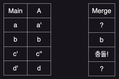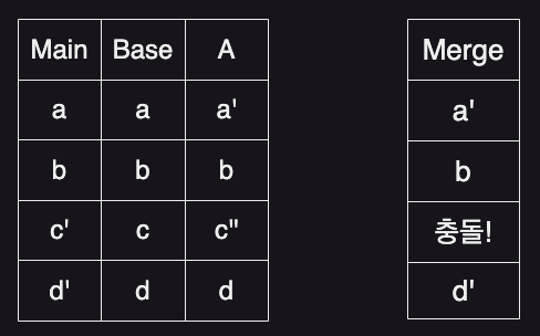 그럼 Base Commit 기준으로 Main 브랜치는 c, d 부분이 수정되었고, A 브랜치는 a, c 가 수정됐음을 인지할 수 있다. 그리고 이를 병합한다면 충돌이 일어난 c 부분만 작업자가 직접 병합하고 나머지는 자동으로 병합되는 상황이다.