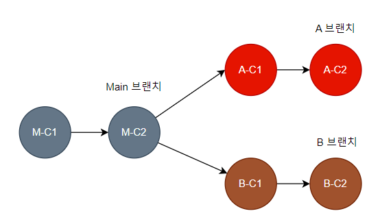 Main 브랜치로부터 생성된 A, B 브랜치