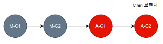 Main 브랜치에서 A 브랜치를 병합할 경우 Main 브랜치의 Head Commit인 M-C2와 A 브랜치의 Base Commit인 M-C2가 같으므로 이 지점을 연결한 후 Main 브랜치의 Head Commit A-C2 브랜치로 이동시키는 Fast Forward 방식으로 병합된다.